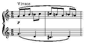 { [ \tempo<"Vivace"> \meter<"5/8"> \intens<"p"> \sl(\bm(g1*1/8 a b) \bm(b& c2) \bm(c# b1 a b& a&)) ], [ \meter<"5/8"> \sl(g1*3/8 d/4 c#*3/8 d/4) ] }